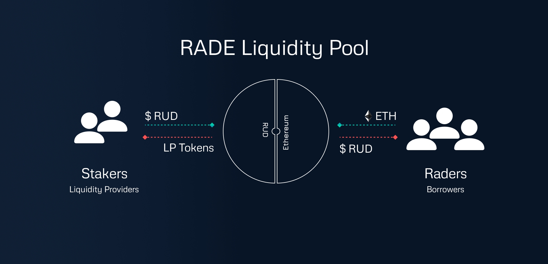 Staking and borrowing and counter-party complementary services provided by RADE as a platform using the RUD stable coin. Borrowers, a.k.a the Raders, borrow coins that were staked by the 'stakers'. Raders and Stakers make a complete round-trip trade.